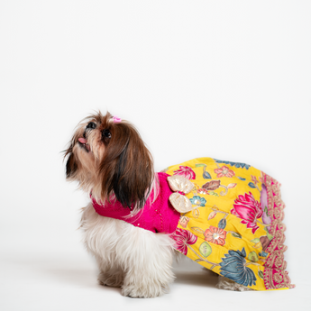 Let your floof gurl slay in style with the Yellow & Pink Floral Pen Kalamkari Dress— the sustainable fashion. It is made with handloom silk which is absolutely soft, comfortable and easy to wear.