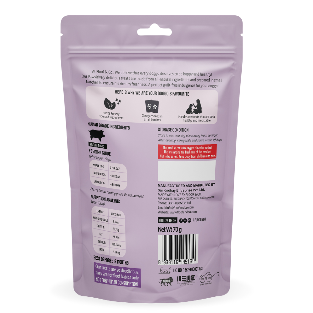 Premium Porcine Perfection: Our crispy jerky is exclusively crafted from top-quality, human-grade pork, ensuring a safe and delightful treat for your beloved pet. We never compromise, strictly avoiding any animal by-products, binding agents, or sweeteners. Your pet deserves nothing less than the finest.
