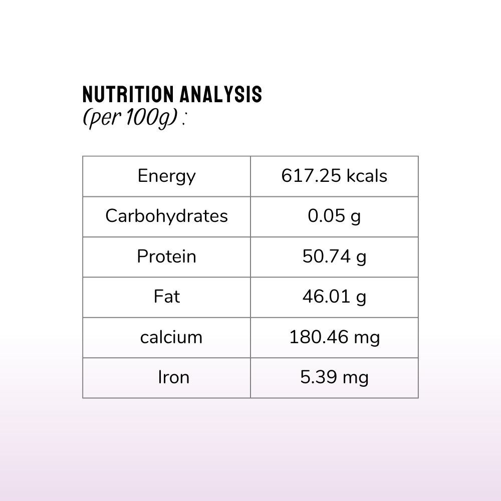 - The product contains an Oxygen Absorber sachet to maintain the freshness of the product. It is not to be eaten. Keep away from children and pets.