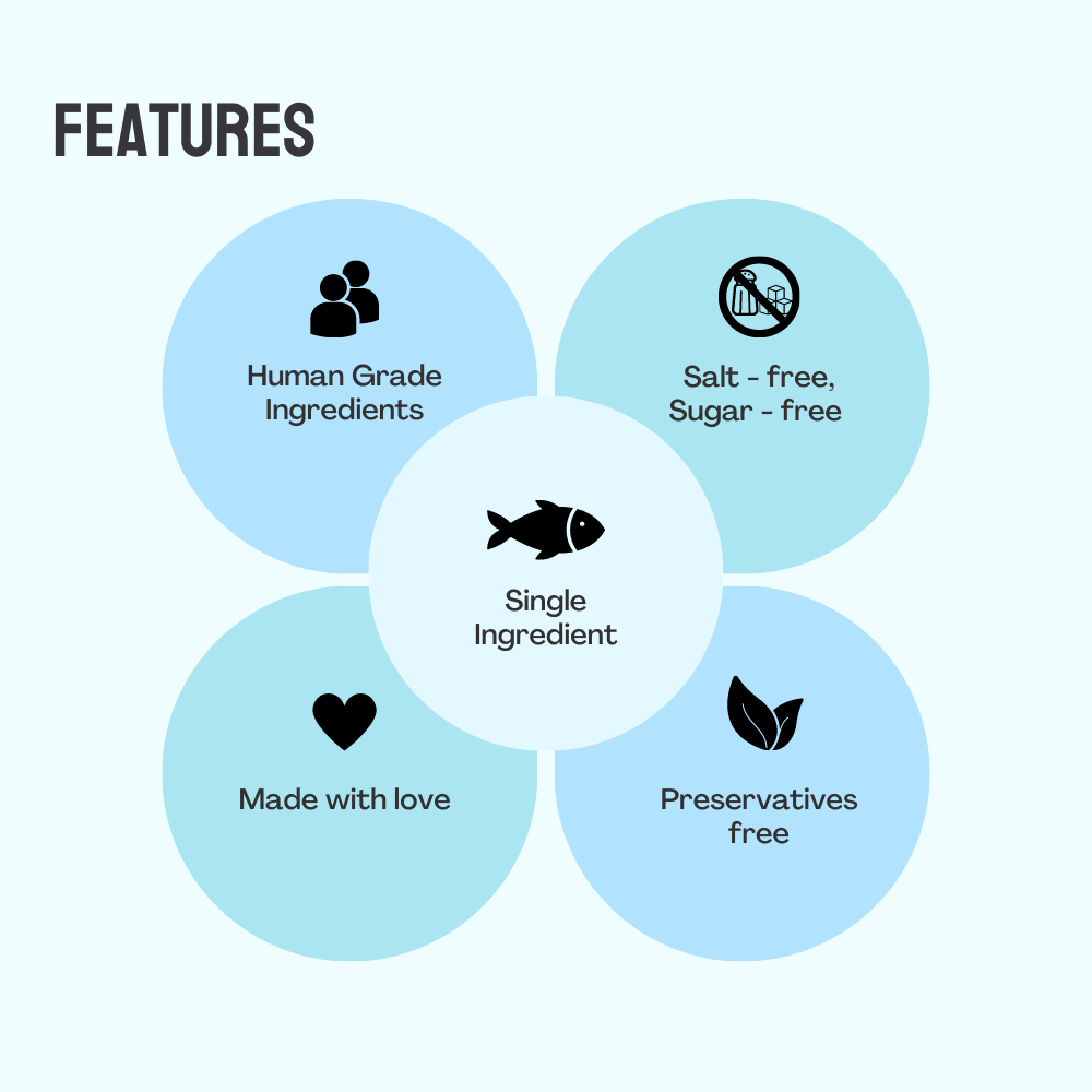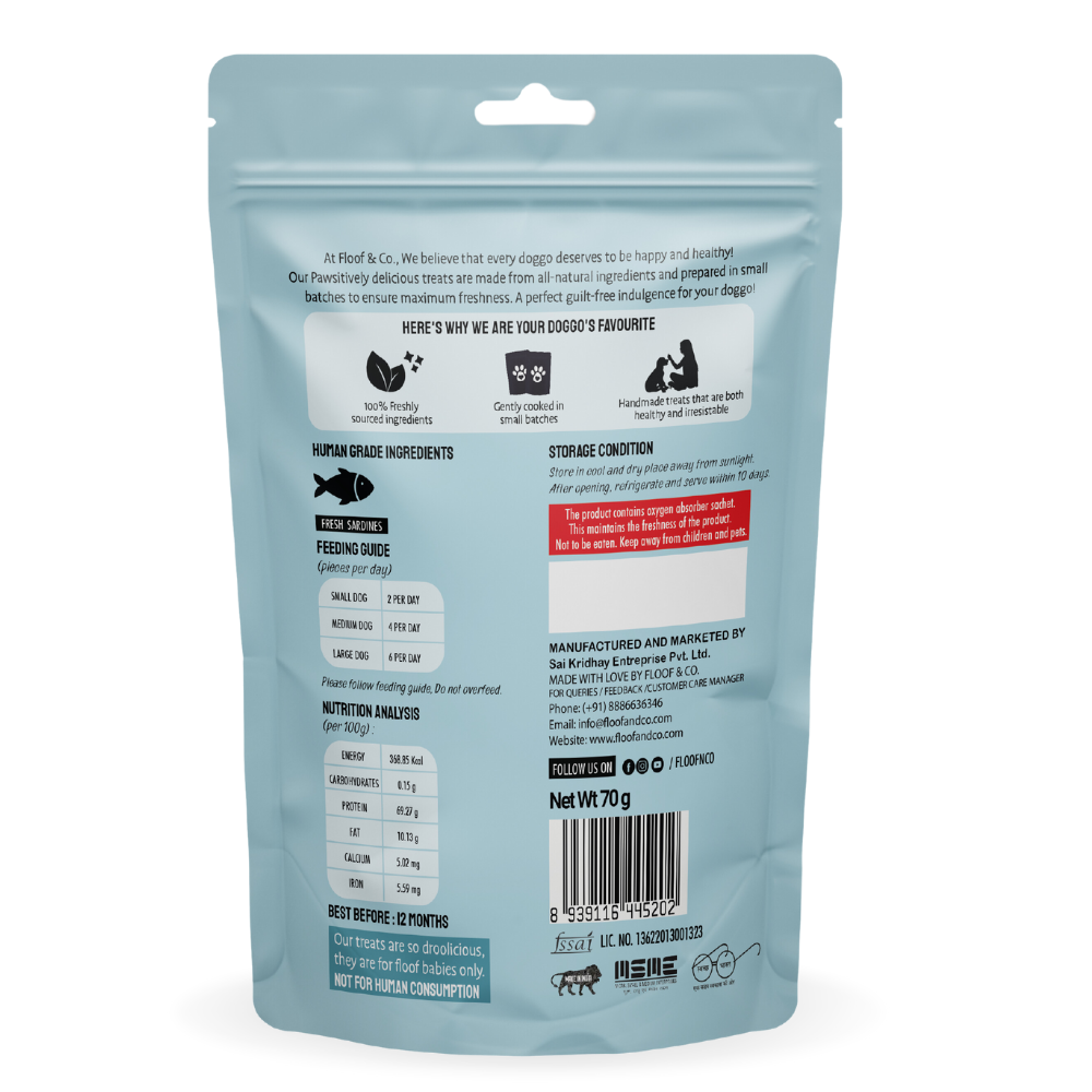 Protein Dynamo: Our jerky brims with protein and low-fat goodness, serving as the perfect snack for energizing active dogs. Crafted with premium sardines, it offers a top-notch protein source that fuels muscle growth and repair.