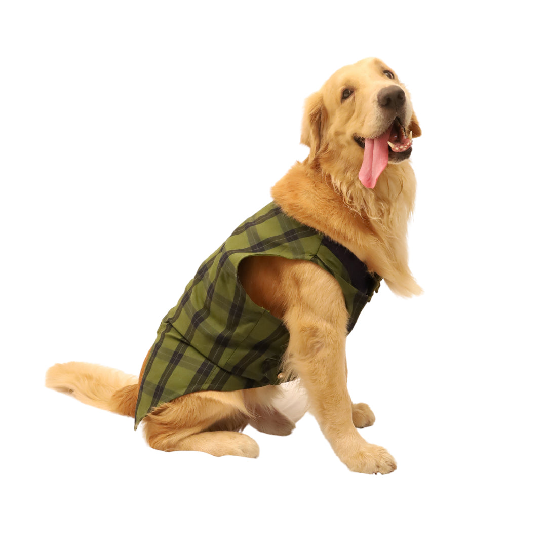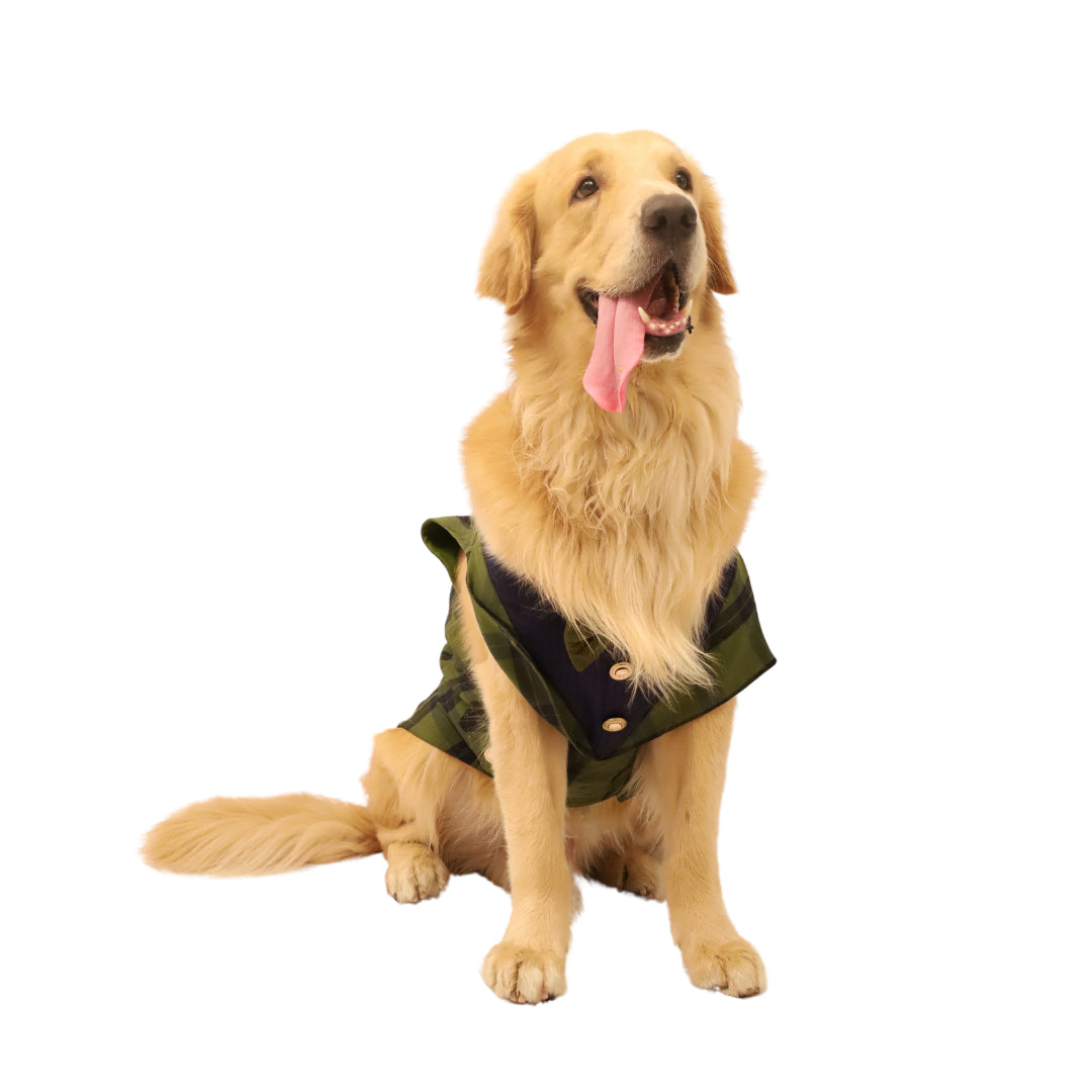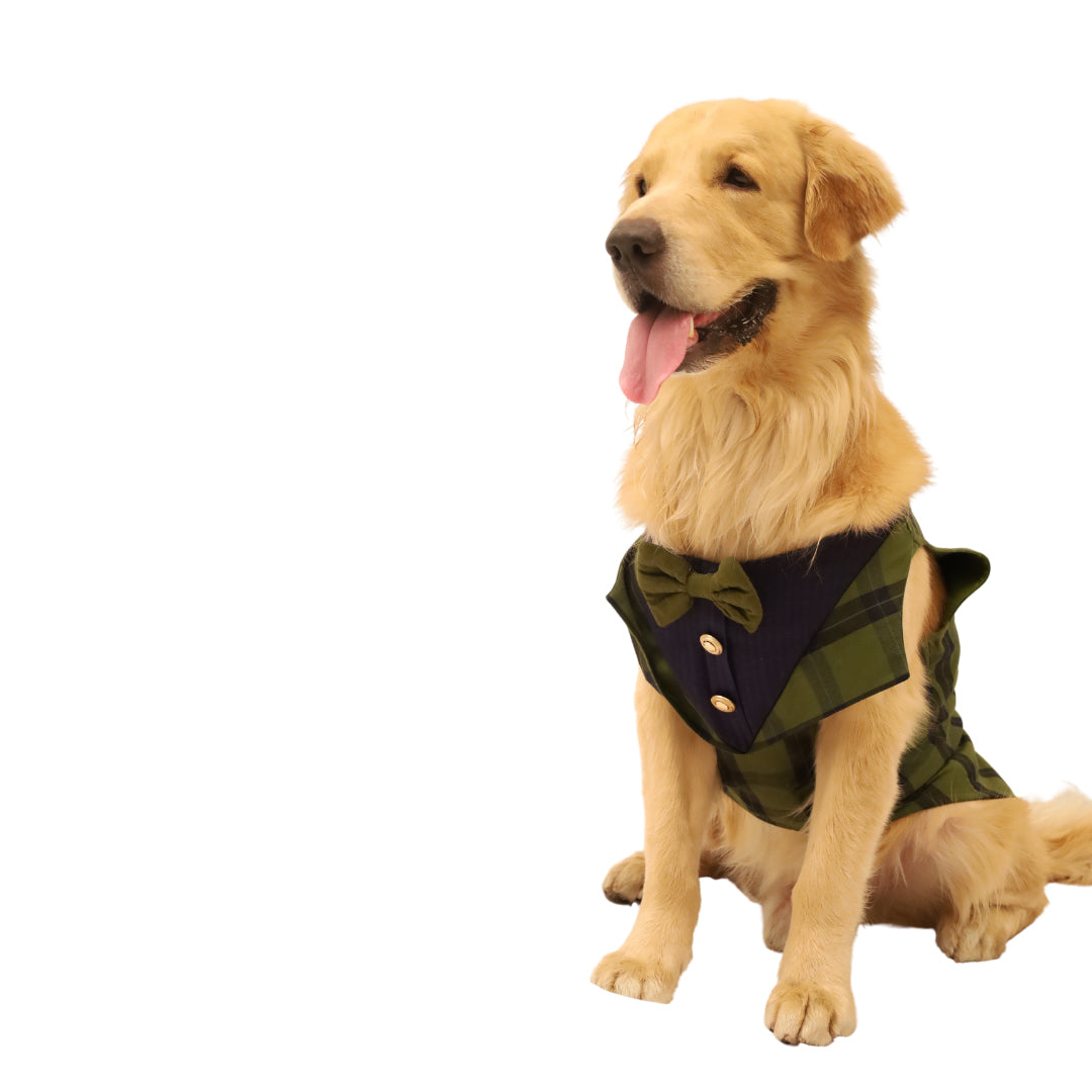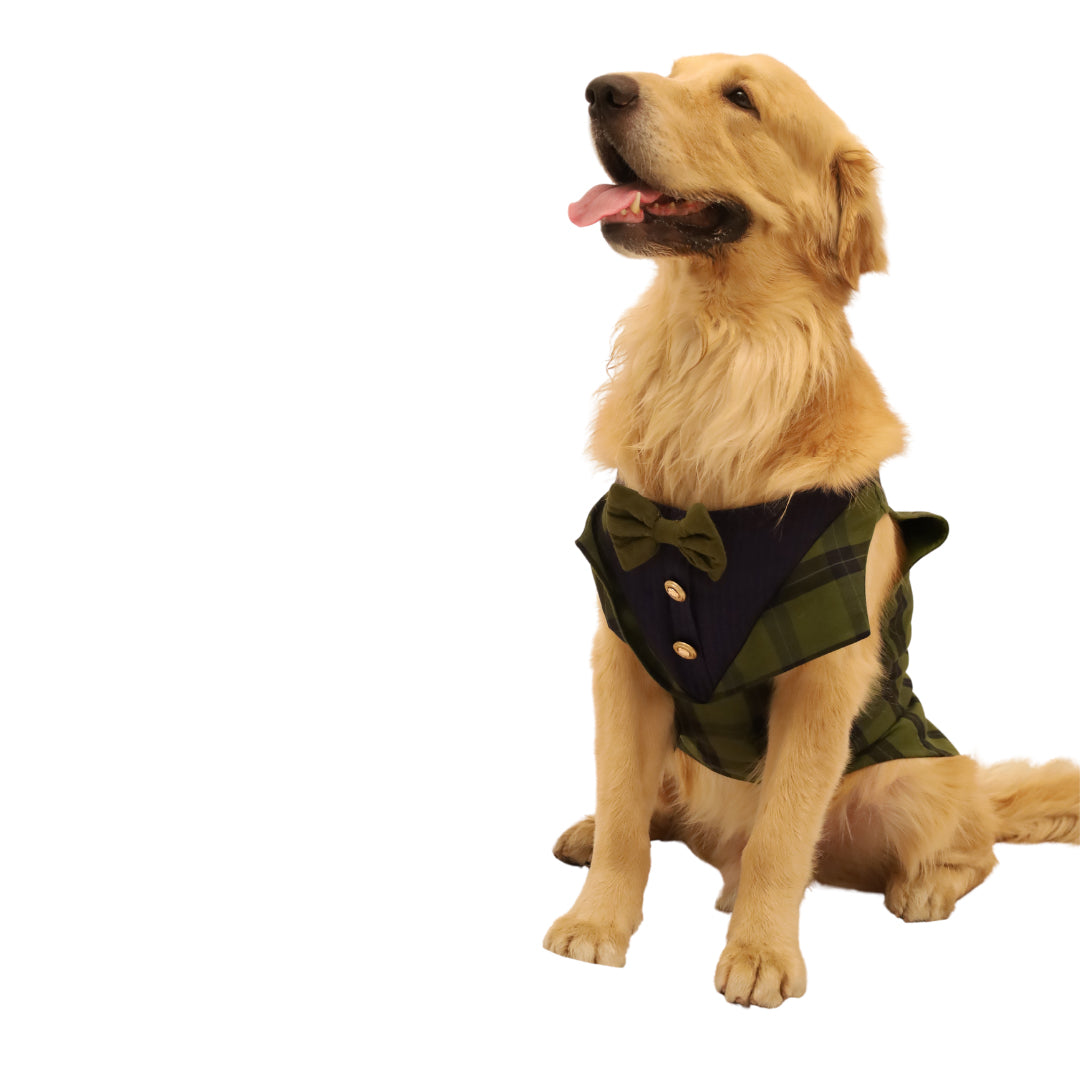 Make your good boi look uber handsome in our handcrafted, super stylish tuxedos. This Green Checks Tuxedo is made with natural dyed handloom cloth. It is extremely soft, comfortable and easy to put on.