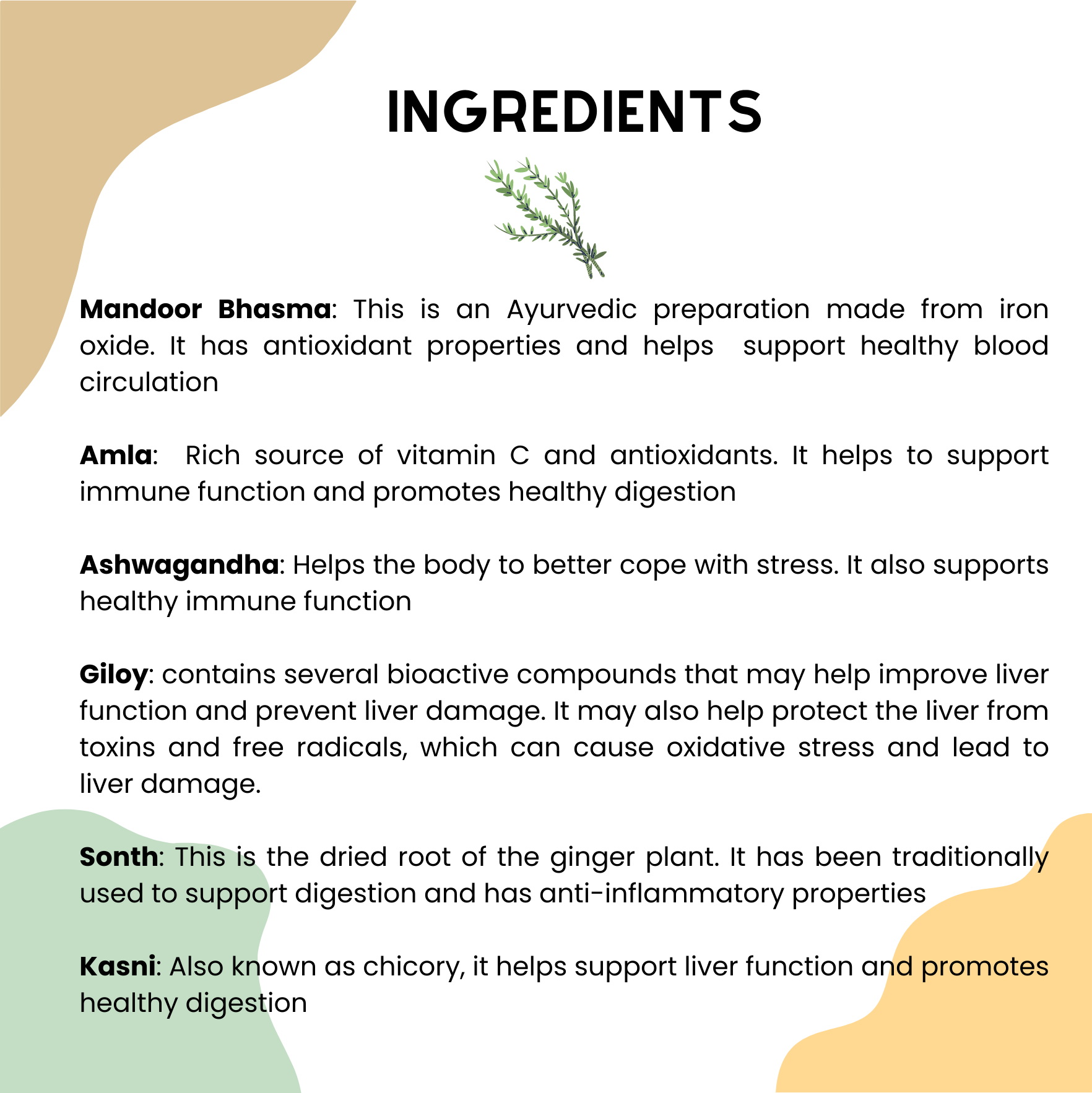 Mandoor Bhasma (AFI) 50 mg, Amla (Emblica Officinalis, Fr) 350mg, Mulethi (Glycyrrhiza Glabra, St) 250 mg, Ashwagandha (Withania Somnifera, Rt) 250 mg, Giloy (Tinospora Cordifolia, St) 250 mg, Sonth (Zingiber Officinale, Rz) 100mg, Son (Foeniculum Vulgare, Sd) 250 mg, Kali Mirch (Piper Nigrum, Fr) 100 mg, Pippali (piper Longum, Fr) 100 mg, Vidarikand (Pueraria Tuberosa, Rz) 300 mg, Makoi (Solanum Nigrum, Wp) 250 Mg, Kasni (Cichorium Endvia, Sd) 500 mg, Sugar Free Base 9.5.