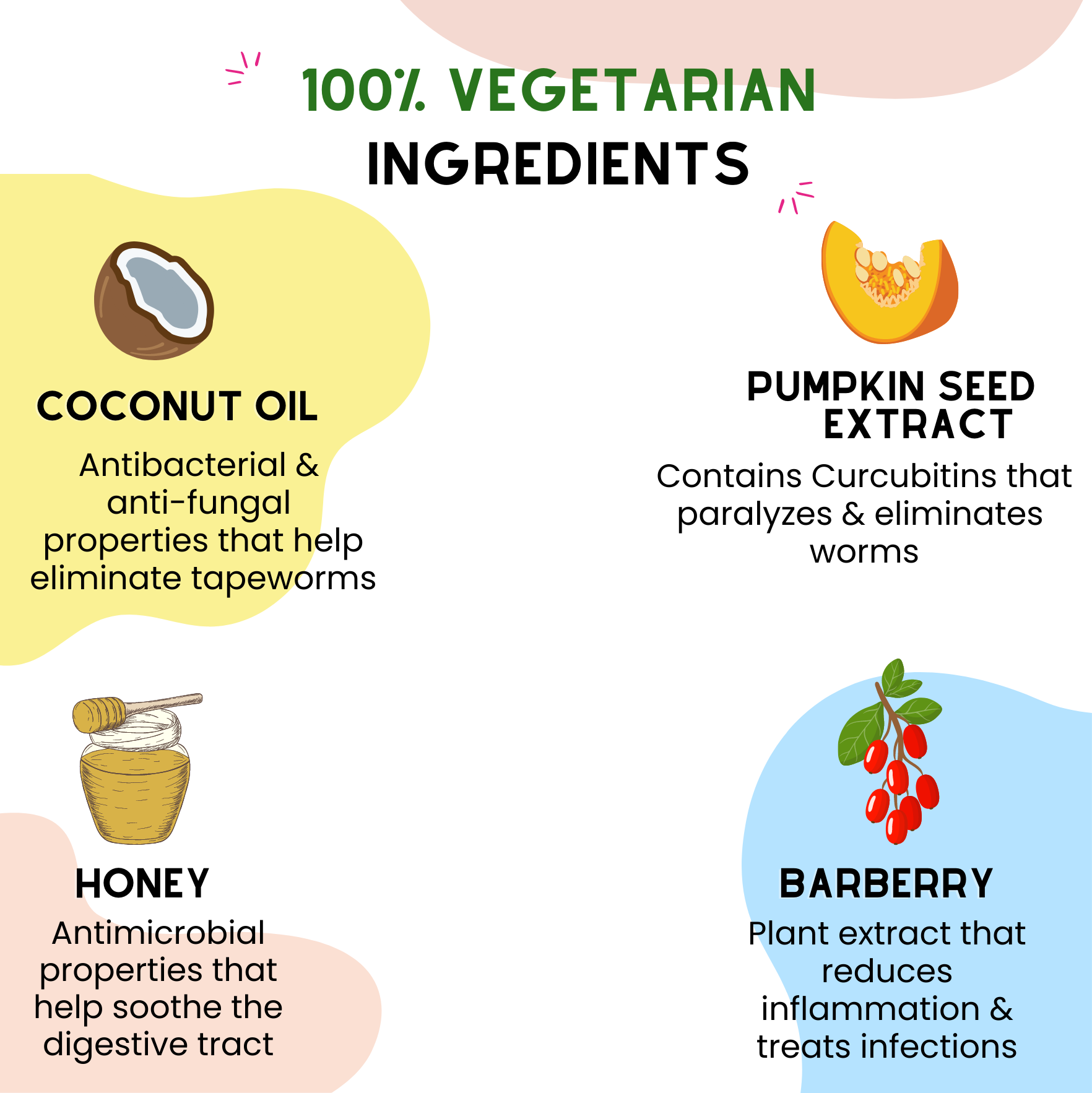 NoMo Worm contains natural ingredients, making it a safe and effective solution for your pet's health. For e.g. Pumpkin seeds contain an amino acid called cucurbitacin, which is toxic to intestinal worms. Coconut oil contains lauric acid, which has antibacterial, antiviral, and antifungal properties. It can help kill off intestinal parasites, including worms. Barberry (Berberis vulgaris) is an herb that is sometimes used in pet dewormers because it contains an alkaloid compound called berberine. Berberine has been shown to have antiparasitic properties and can help kill off intestinal worms in pets. Barberry is also known for its anti-inflammatory and antimicrobial properties, which can help support a healthy digestive tract in pets.
