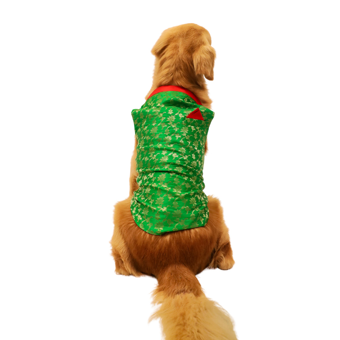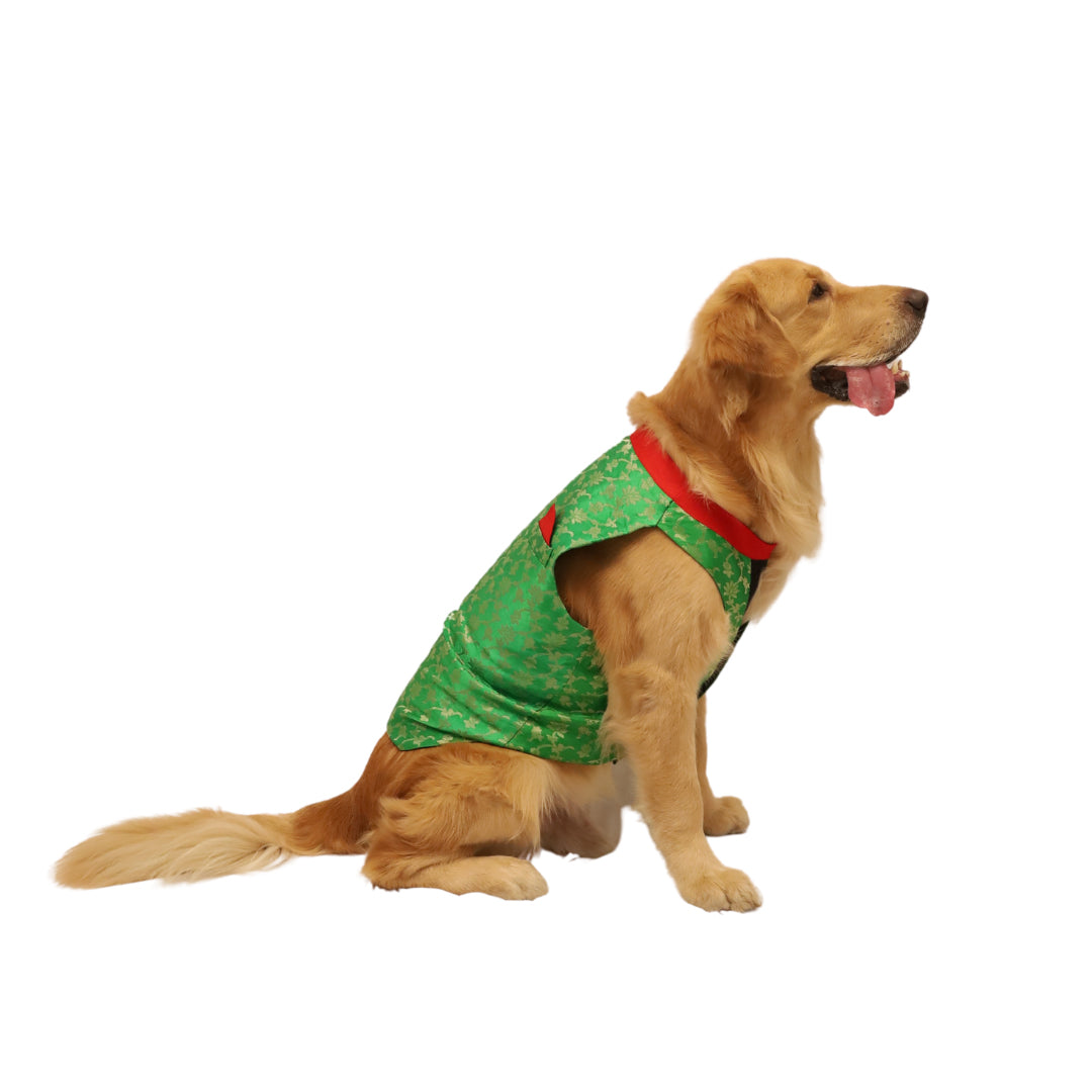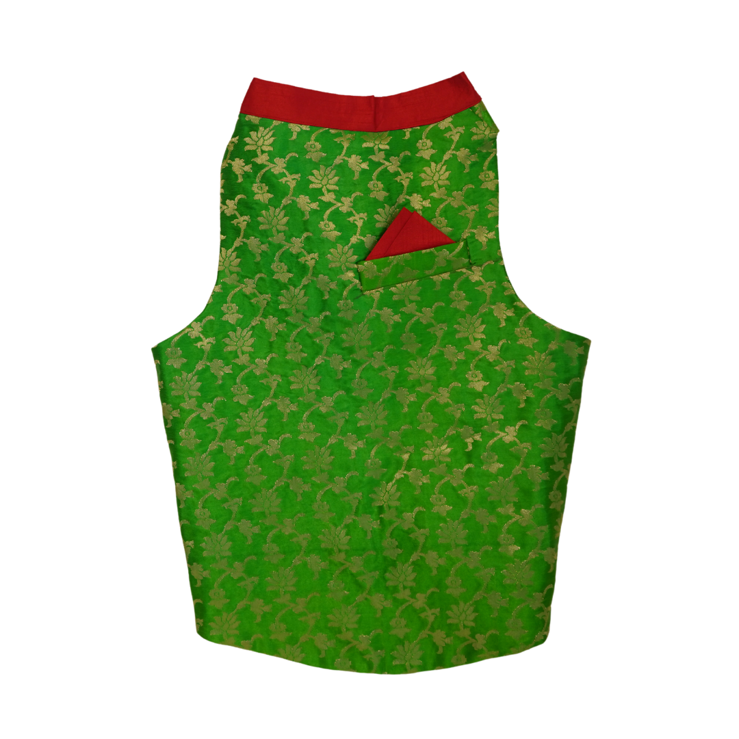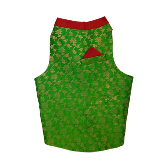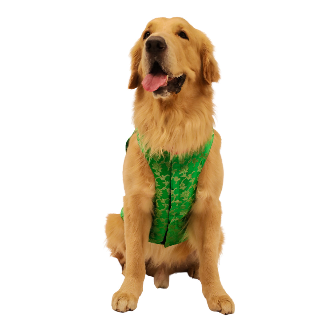 Dress your handsome in our royal and elegant Green Banarasi Sherwani. Extremely soft to touch and comfortable to wear. Let your pupper bask in sustainable fashion clothing!