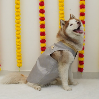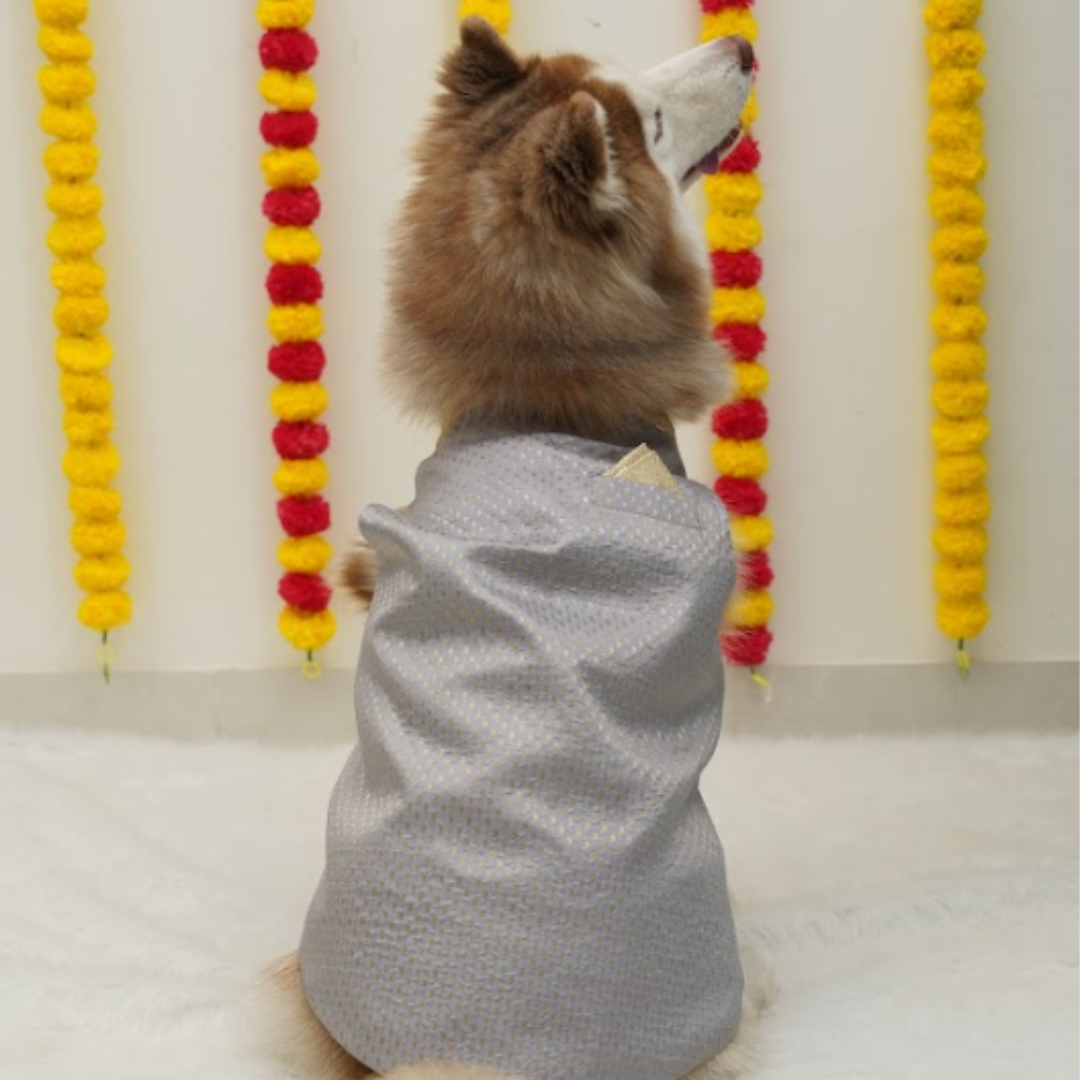 Dress your handsome in our royal and elegant Blue Banarasi Sherwani. Extremely soft to touch and comfortable to wear. Let your pupper bask in the sustainable fashion clothing!