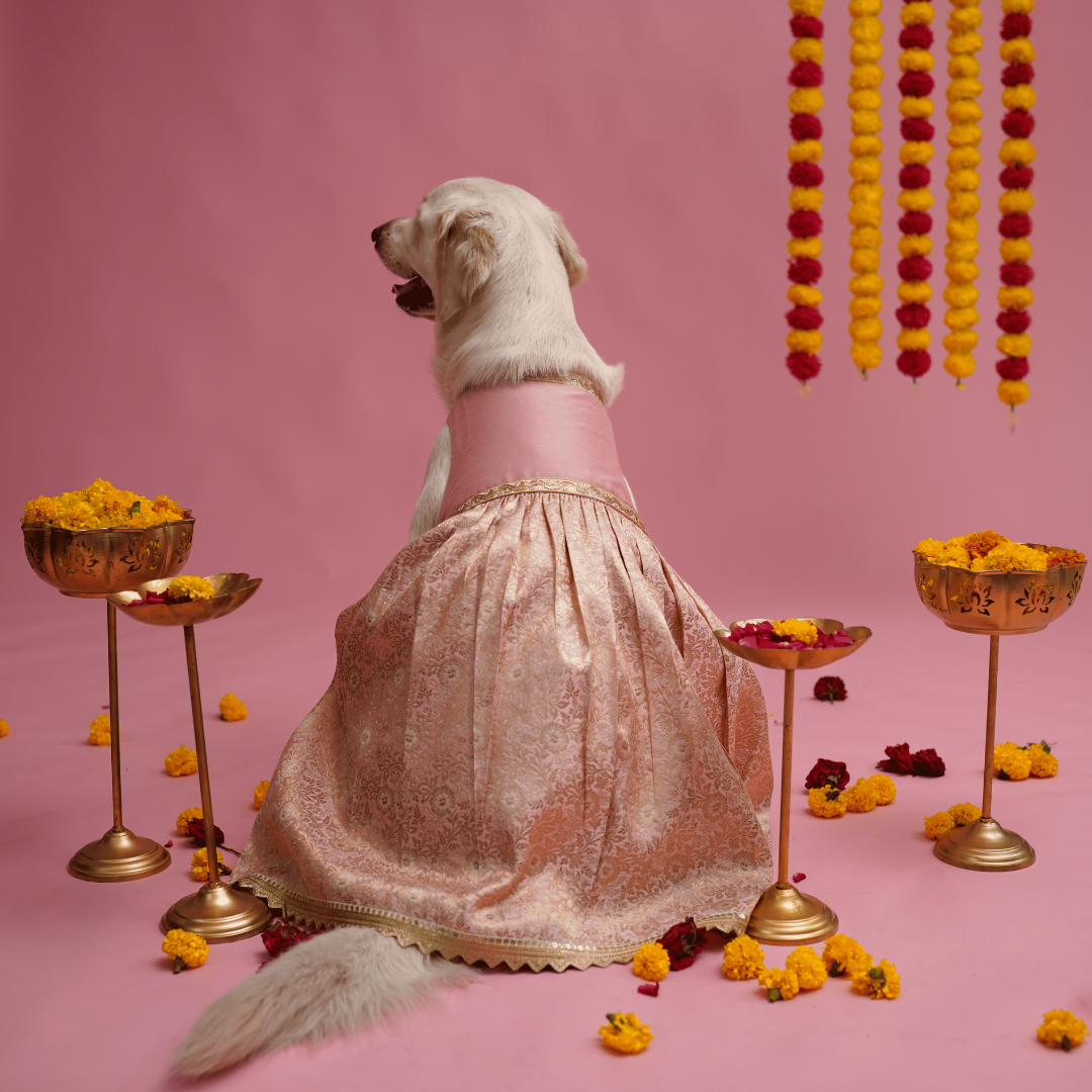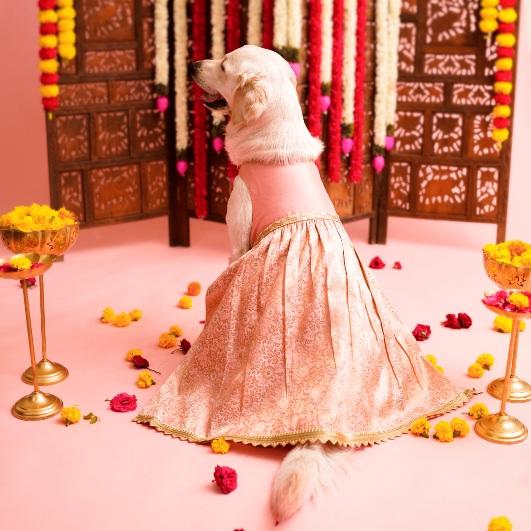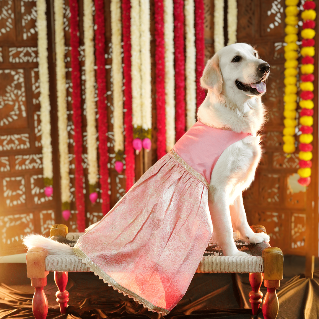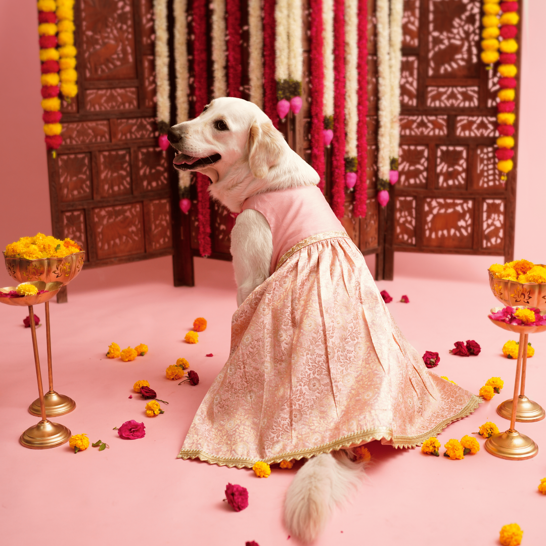 Dress your handsome in our royal and elegant Pastel Pink & Gold banarasi Lehenga. Extremely soft to touch and comfortable to wear. Let your pupper bask in the sustainable fashion clothing!