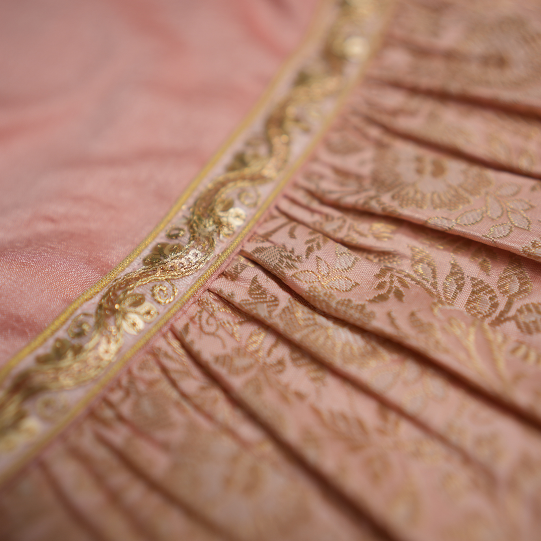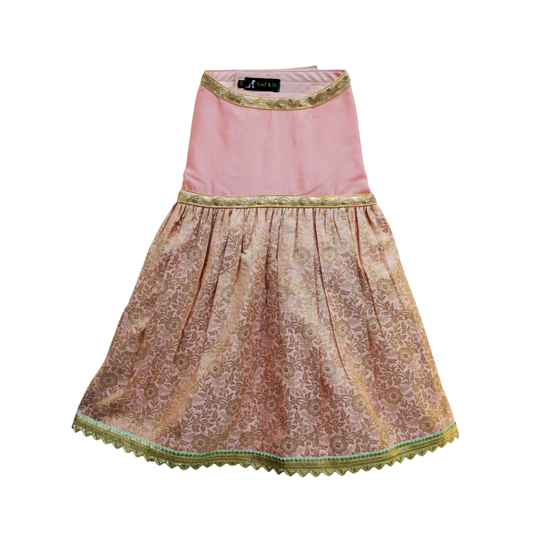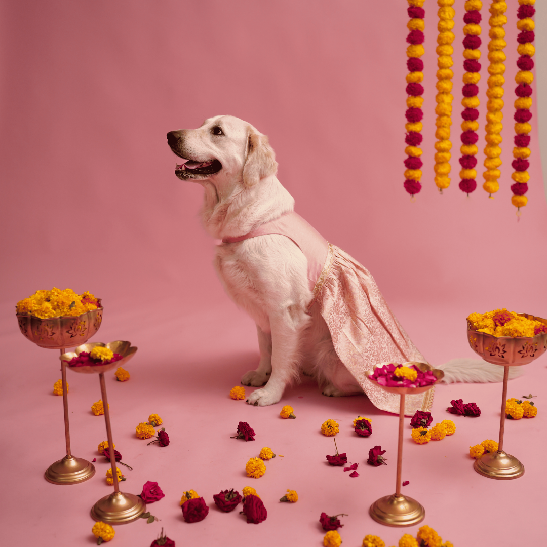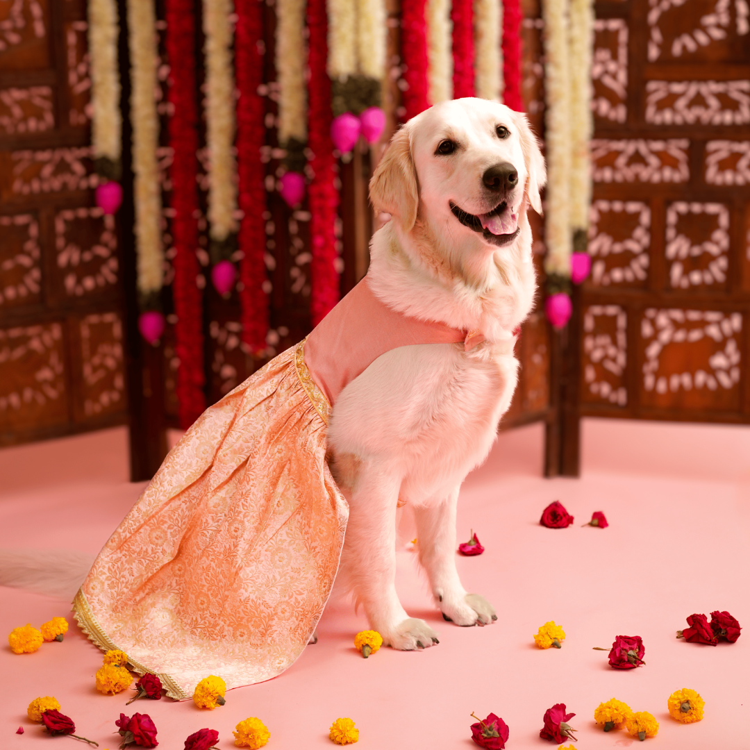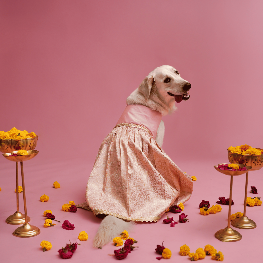 Dress your handsome in our royal and elegant Pastel Pink & Gold banarasi Lehenga. Extremely soft to touch and comfortable to wear. Let your pupper bask in the sustainable fashion clothing!