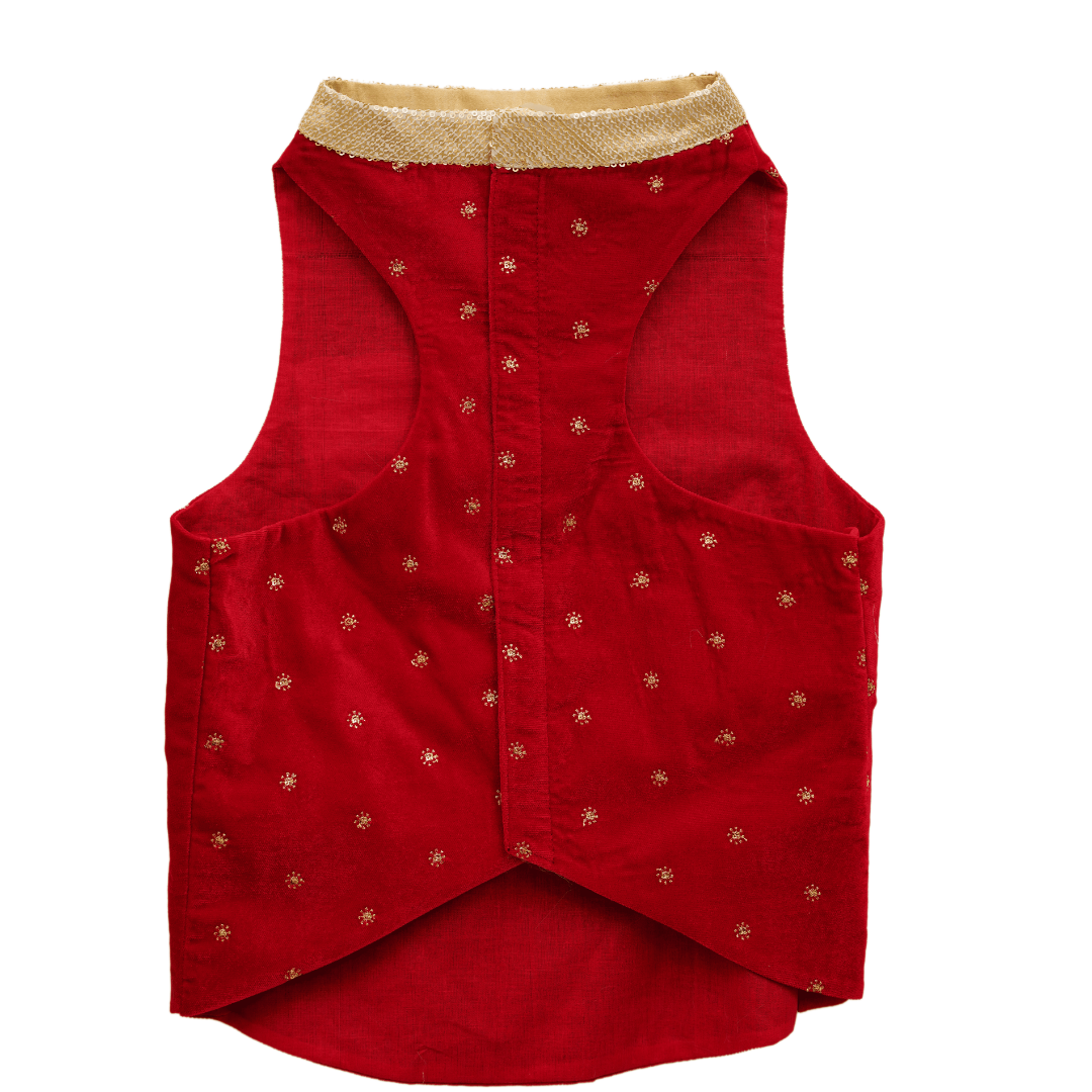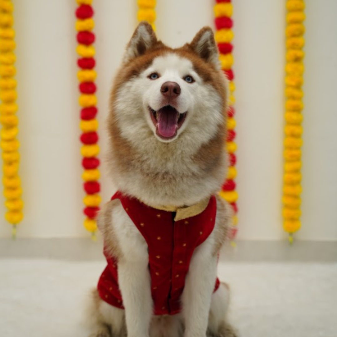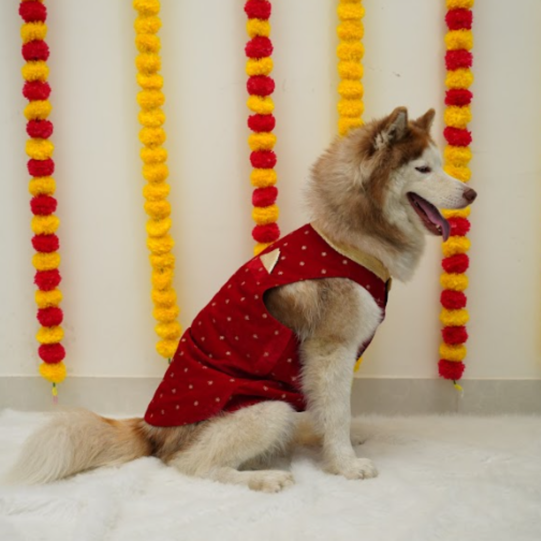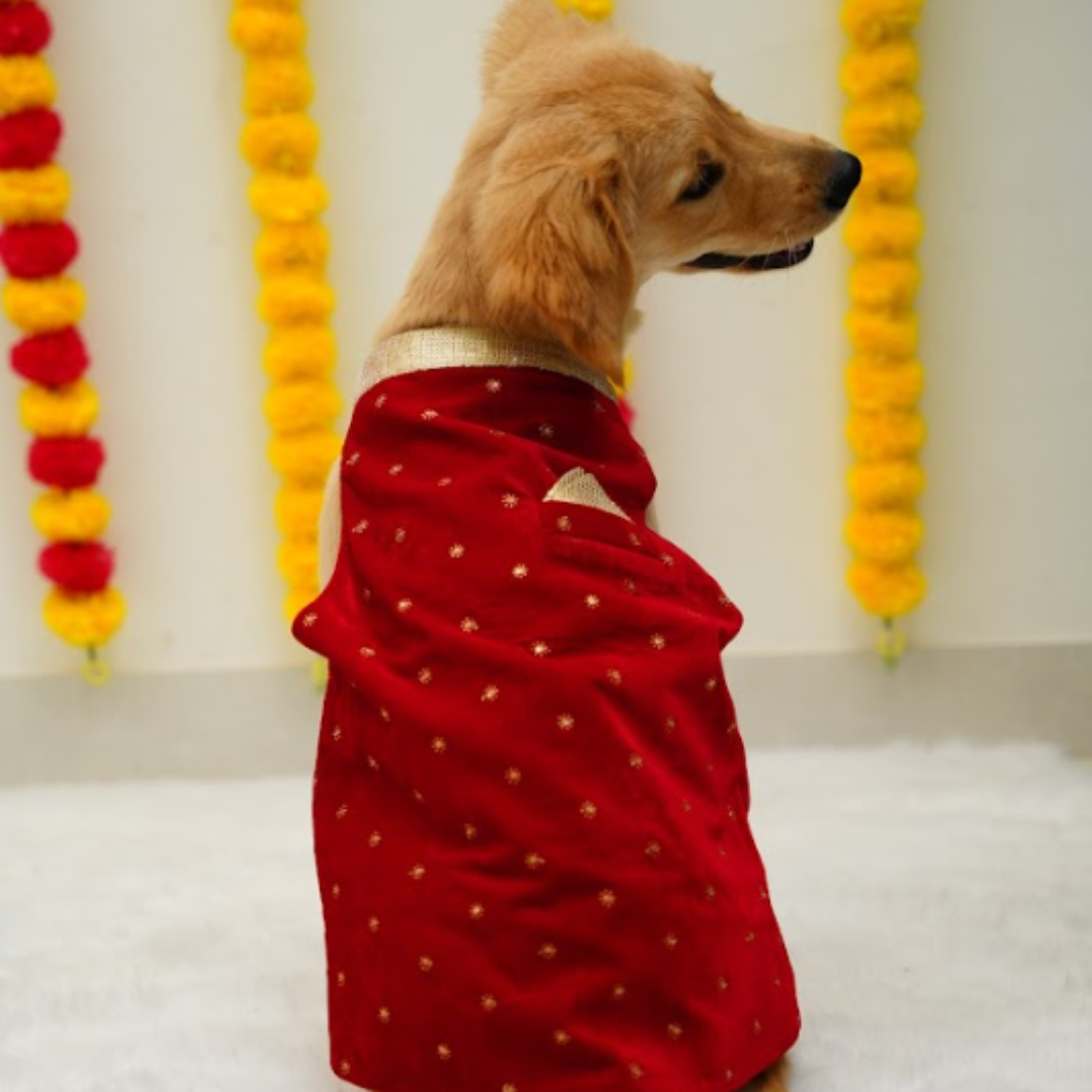 Dress your handsome in our royal and elegant Blue Banarasi Sherwani. Extremely soft to touch and comfortable to wear. Let your pupper bask in the sustainable fashion clothing!