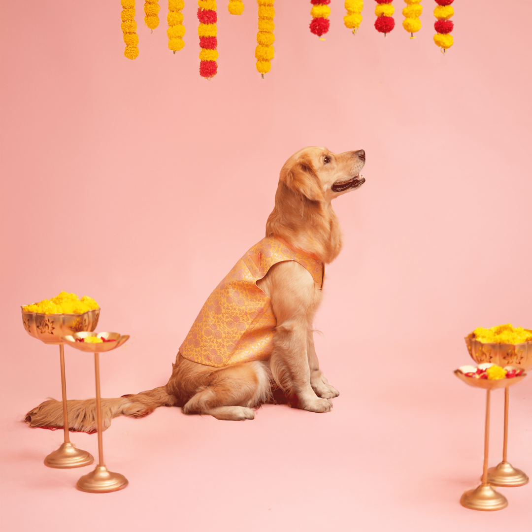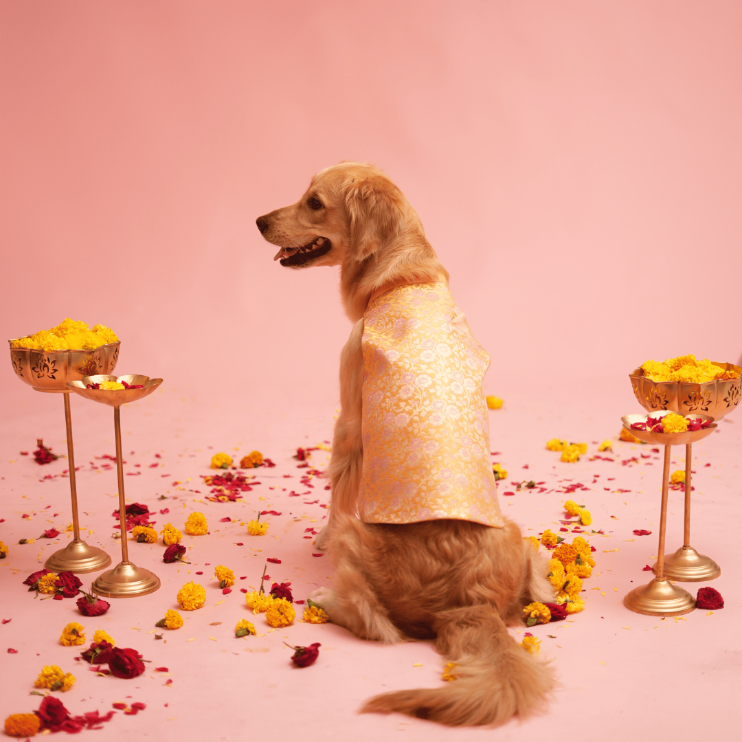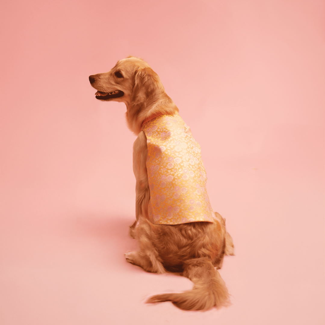 Dress your handsome in our royal and elegant Yellow & Pink banarasi Sherwani. Extremely soft to touch and comfortable to wear. Let your pupper bask in the sustainable fashion clothing!