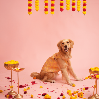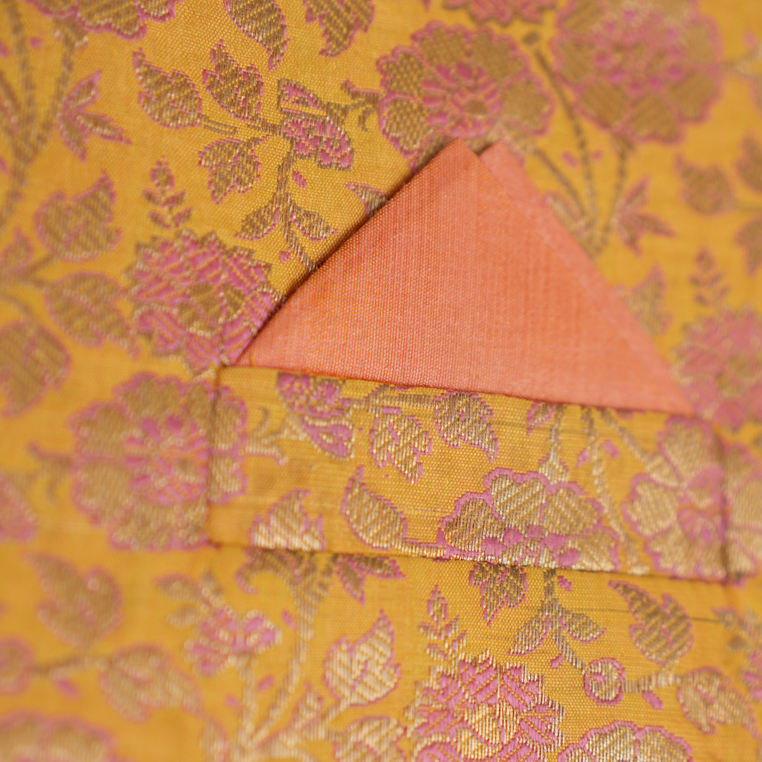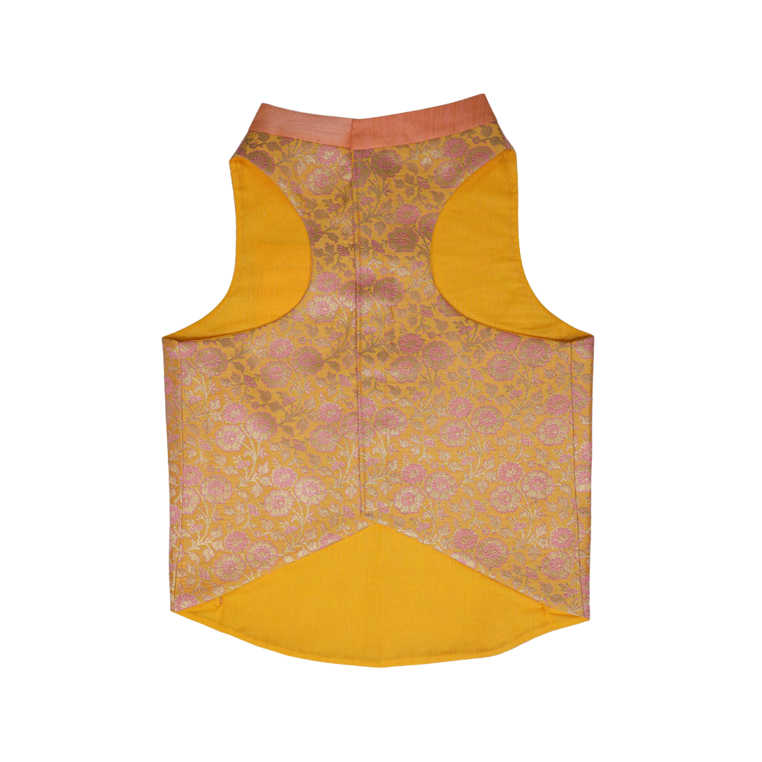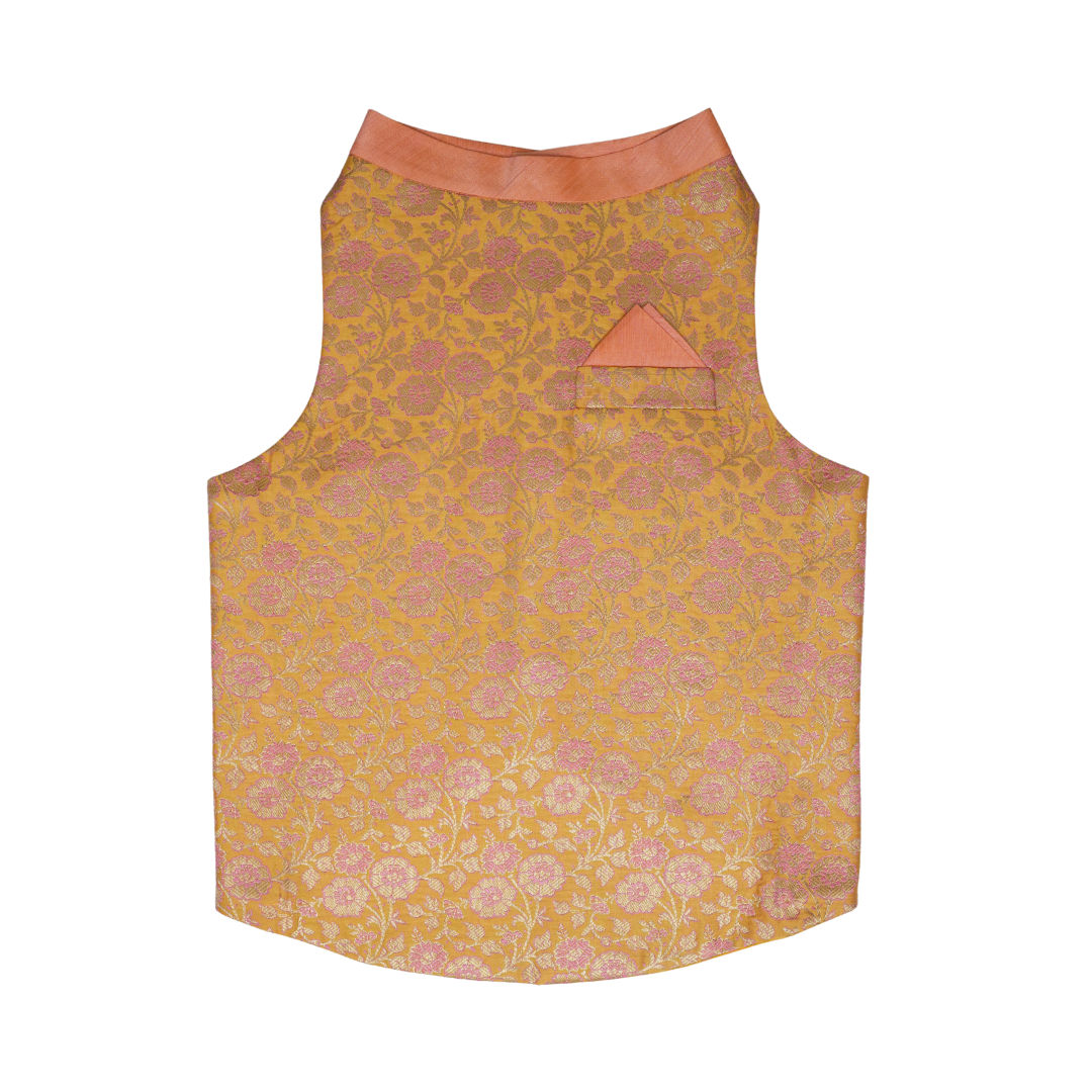Dress your handsome in our royal and elegant Yellow & Pink banarasi Sherwani. Extremely soft to touch and comfortable to wear. Let your pupper bask in the sustainable fashion clothing!